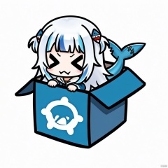 chibi, in-box, > <,1girl, gawr gura, virtual youtuber, tail, fish tail, shark tail, solo, blue eyes, multicolored hair, grey hair, full body, blue hair, streaked hair, bangs, hair ornament, shark hair ornament, two side up, white background, hood, blunt bangs, shark girl, hoodie, simple background, blue hoodie