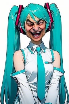 Mr.Bean-face,(masterpiece, best quality), BREAK 1girl, hatsune miku, solo, twintails, long hair, closed eyes, aqua hair, heart, detached sleeves, open mouth, sleeveless shirt, shirt, smile, very long hair, sleeveless, blush stickers, pink eyes, simple background, hair ornament, bangs, upper body, necktie, white background, no nose, aqua necktie