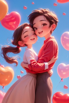 masterpiece,best quality,1girl, blush, smile, open_mouth, skirt, brown_hair, shirt, 1boy, dress, brown_eyes, jewelry, ponytail, hetero, heart, earrings, one_eye_closed, pants, plaid, hug, couple, child, female_child, balloon, cheek-to-cheek, heart_balloon