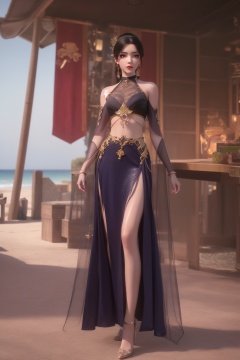 photo_\(medium\),(8k, RAW photo, best_quality),(masterpiece:1.2),(realistic:1.2),(photorealistic:1.3),(ultra-detailed),(extremely_detailed_cg_8k_wallpaper),(crystal_texture_skin:1.3),(shiny:1.2),(shiny_skin:1.4),(extremely_delicate_and_beautiful),shenfengLingLuoChen,1girl,solo,dress,torogao,arabian clothes,chinese clothes,breasts,hair bun,bare shoulders,choker,crop top,skirt,standing,see-through,jewelry,hair ornament,earrings,red lips,realistic,looking at viewer,high heels,Summer,Beach,Sea,sunshine,<lora:shenfengLuLaoBan_20240519223355-000006:0.7>,