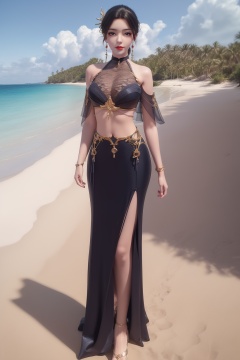 photo_\(medium\),(8k, RAW photo, best_quality),(masterpiece:1.2),(realistic:1.2),(photorealistic:1.3),(ultra-detailed),(extremely_detailed_cg_8k_wallpaper),(crystal_texture_skin:1.3),(shiny:1.2),(shiny_skin:1.4),(extremely_delicate_and_beautiful),shenfengLingLuoChen,1girl,solo,dress,torogao,arabian clothes,chinese clothes,breasts,hair bun,bare shoulders,choker,crop top,skirt,standing,see-through,jewelry,hair ornament,earrings,red lips,realistic,looking at viewer,high heels,Summer,Beach,Sea,sunshine,<lora:shenfengLuLaoBan_20240519223355-000006:0.7>,