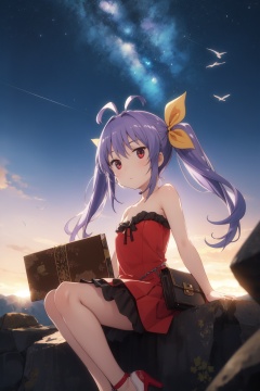 <lora:Renge-000003:0.8>,Renge CYQL,1girl,looking at viewer,solo,twintails,purple hair,long hair,antenna hair,hair ribbon,red eyes,loli,strapless dress with metallic heels and a statement clutch.,Neutral, A relaxed facial expression with a slightly open mouth.,bust,beautiful face,beautiful eyes,glossy skin,shiny skin,Volcano, Lava, Ash, Crater, Smoke, Rocks, Seabirds, Magma,(Japanese maples, Snow-covered branches, Winter garden, Tranquil setting, Japanese elegance, Frosty beauty:0.6),beautiful detailed sky,beautiful detailed glow,masterpiece,best quality,beautiful and aesthetic,wallpaper,