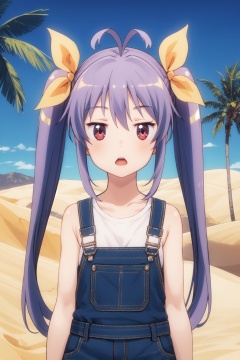 <lora:Renge-000003:0.8>,Renge CYQL,1girl,looking at viewer,solo,twintails,purple hair,long hair,antenna hair,hair ribbon,red eyes,loli,**** top, denim overalls, sneakers,Neutral, A relaxed facial expression with a slightly open mouth.,bust,beautiful face,beautiful eyes,glossy skin,shiny skin,Oasis, Sand dunes, Palm trees, Water, Camel, Heat, Mirage,(Agave plants, Succulents, Desert landscape, Cacti, Warm desert sun, Arid climate:0.6),beautiful detailed sky,beautiful detailed glow,masterpiece,best quality,beautiful and aesthetic,wallpaper,