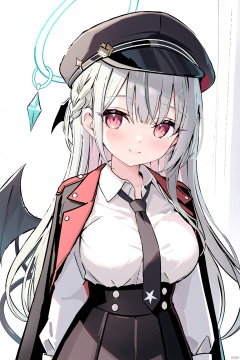 long hair, breasts, bangs, skirt, shirt, red eyes, long sleeves, hat, medium breasts, jacket, tail, white shirt, braid, ((grey hair)), pantyhose, wings, necktie, collared shirt, black skirt, black jacket, black pantyhose, single braid, black headwear, halo, demon tail, peaked cap, black necktie, black wings, demon wings, high-waist skirt, jacket on shoulders, single wing,harunaBA