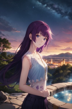 <lora:Hitagi-000008:0.8>,Hitagi CYQL,1girl,looking at viewer,solo,long hair,purple hair,blue eyes,Linen culottes, crop top, lace-up sandals,Sensual, A deep, intense gaze, a slow, deliberate smile, and a relaxed posture.,portrait,beautiful face,beautiful eyes,glossy skin,shiny skin,Geysers, Volcanic, Steam, Landscape, Hot Springs, Colors, Serenity, Power,(Bamboo shoots, Bamboo grove, Misty atmosphere, Morning tranquility, Bamboo shadows, Zen serenity:0.6),beautiful detailed sky,beautiful detailed glow,masterpiece,best quality,beautiful and aesthetic,wallpaper,