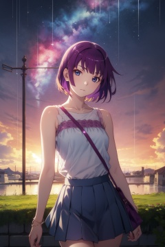 <lora:Hitagi:0.8>,Hitagi CYQL,1girl,looking at viewer,solo,short hair,purple hair,blue eyes,Tulle midi skirt, silk camisole, strappy sandals, crystal earrings, clutch purse,Teasing, A playful smirk, a raised eyebrow, and a hint of dominance.,panorama,beautiful face,beautiful eyes,glossy skin,shiny skin,Rainbow, Rain, Colors, Sky, Horizon, Beauty, Serenity, Magic,(Bonsai trees, Moss, Gravel pathways, Raked sand, Tranquility, Meditation:0.6),beautiful detailed sky,beautiful detailed glow,masterpiece,best quality,beautiful and aesthetic,wallpaper,
