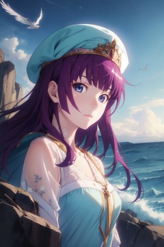 <lora:Hitagi-000008:0.8>,Hitagi CYQL,1girl,looking at viewer,solo,long hair,purple hair,blue eyes,Vintage-inspired ensemble with a A-line dress, pillbox hat, and gloves,Bored, A slack jaw, drooping eyelids, and a slightly uninterested gaze.,bust,beautiful face,beautiful eyes,glossy skin,shiny skin,Cliffs, Waves, Coastline, Rocks, Sea spray, Seagulls, Dramatic, Power,(Epiphytes, Rainforest canopy, Canopy walk, Exotic birds, Tropical humidity, Rainforest adventure:0.6),beautiful detailed sky,beautiful detailed glow,masterpiece,best quality,beautiful and aesthetic,wallpaper,
