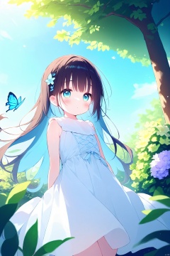 artist:nano,wide shot,(depth of field),global illumination,soft shadows,backlight,lens masterpiece,best quality,flare,((colorful refraction)),((cinematic lighting),looking outside,with butterfly,1girl with lightblue long hair and blue aqua eyes,hair flowers,hime cut,sunlight,blurry background,blurry,garden,White Dress,