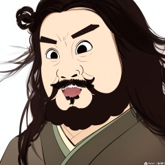 simple background,black hair,white background,upper body,male focus,japanese clothes,black eyes,facial hair,beard,mustache,A female man