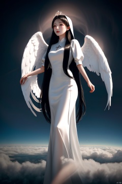 (Long, black, graceful hair, white, silky skin.White and graceful angel wings)