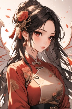 1girl, solo, hair ornament, jewelry, earrings, petals, flower, upper body, long hair, chinese clothes, long sleeves, , (\shen ming shao nv\),wings