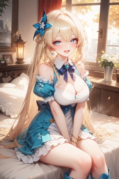 1girl, long hair, breasts, blonde hair, blue eyes, solo, hair ornament, flower, smile, open mouth, vert (neptune series), cleavage, hair flower, dress, sitting, bare shoulders, boots, looking at viewer, large breasts, window, short sleeves, ribbon, :d, very long hair, puffy sleeves, knee boots, puffy short sleeves, heart, jewelry, indoors, blush, bangs