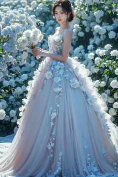 (best quality, masterpiece:1.3),1girl,dress,solo,flower,white flower,breasts,earrings,black hair,cleavage, (looking_at_viewer:1.4),(eye-contact:1.4), jewelry: spring_flower, (blue wedding dress:1.4), Tindal Light, <lora:YG花海:0.7>,