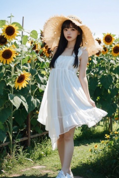 (RAW photo, 4k, realistic), masterpiece, best quality, official art, ultra-high resolution, original photo, 8k quality, super realistic, super realistic, extremely beautiful skin, 1 girl, solo, long hair, looking at the audience, bangs, black hair, hats, dresses, standing, whole body, flowers, outdoor, shoes, sleeveless, sky, dull bangs, white dress, lips, sleeveless dress, sunshine, white shoes, grass, plants, arms behind the back, sun hat, straw hat, sunflowers, headwear, sun, digital photos in real life, amazing beauty, amazing The details, full of stunning vitality and contrasting colors, photography (Hasselblad photography), (photography lighting), soft lighting, dynamic angles, vivid lighting, exquisite techniques, Harmonious composition, cowboy photography,