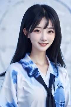 tie dye,1girl,traditional tie-dye, tie-dye clothing,long hair,black hair,black eyes,long shawl hair,bangs,delicate facial features,smile,upper body,3D,realistic,simple background,girl, blooming cheer cartoon style, claystyle,moyou
