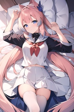 (masterpiece, best quality:1.2),insanely detailed,absurdres,ultra-highres,ultra-detailed,best quality,slender,kawaii,perfect symmetrical face,ultra cute girl,ultra cute face,ultra detailed eyes,ultra cute,ultra beautifu,from above,lying,on bed,on back,looking down,looking at viewer,sangonomiya kokomi,hair ornament,white pantyhose,1girl,solo,long hair,<lora:Sangonomiya Kokomi-000001:0.7>,school uniform,