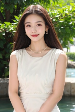1girl, solo, dress, long hair, white dress, outdoors, looking at viewer, smile, blurry background, jewelry, sleeveless, tree, realistic, black hair, earrings, sleeveless dress, blurry, brown eyes, brown hair, upper body, water, lips
