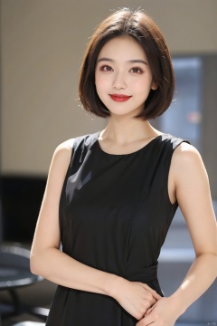 1girl, solo, dress, black dress, looking at viewer, short hair, sleeveless, black hair, sleeveless dress, standing, brown eyes, smile, blurry background, red lips, blurry, lips, long dress