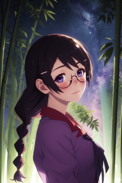 <lora:Tsubasa-000009:0.8>,Tsubasa cyql,1girl,looking at viewer,solo,black hair,long hair,twin braids,hairclip,hair ornament,glasses,school uniform,purple eyes,shirt,puffy sleeves,breasts,pink shirt,blush,Confused, Wide-open eyes, a slightly furrowed brow, and a slightly open mouth.,bust,beautiful face,beautiful eyes,glossy skin,shiny skin,Bamboo, Grove, Breeze, Peaceful, Tranquility, Nature, Serenity, Zen,(Giant sequoias, Moss-covered logs, Ferns, Misty air, Coastal fog, Redwoods:0.6),beautiful detailed sky,beautiful detailed glow,posing in front of a colorful and dynamic background,masterpiece,best quality,beautiful and aesthetic,contrapposto,female focus,wallpaper,fashion,