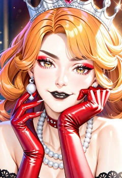 1girl,    gloves, red gloves, jewelry, solo, hand on own face, long hair, lips, crown, looking at viewer, eyeshadow, pearl necklace, fangs, black lips, necklace, red collar, bare shoulders, skull print, collarbone, hand on own cheek, white eyes, curly hair, earrings, collar, light smile, portrait, lipstick, orange hair, makeup, elbow gloves, closed mouth, realistic, brown eyes, masterpiece, best quality, newest,  safe