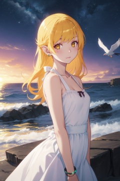 <lora:Acerola-000007:0.8>,Acerola cyql,1girl,looking at viewer,solo,blonde hair,long hair,yellow eyes,blush stickers,dress,bare shoulders,pointy ears,collarbone,bracelet,white dress,jewelry,Annoyed, Mouth turned down slightly, eyes narrowed, and a tense jaw.,bust,beautiful face,beautiful eyes,glossy skin,shiny skin,Cliffs, Waves, Coastline, Rocks, Sea spray, Seagulls, Dramatic, Power,(Maple trees, Pumpkin patches, Fall foliage, Crisp air, Harvest time, New England landscape:0.6),beautiful detailed sky,beautiful detailed glow,posing in front of a colorful and dynamic background,masterpiece,best quality,beautiful and aesthetic,contrapposto,female focus,wallpaper,fashion,