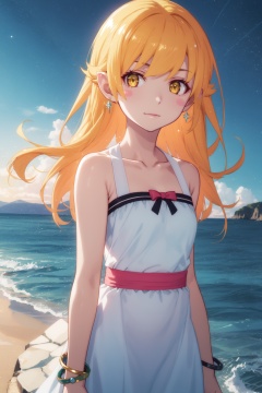 <lora:Acerola-000007:0.8>,Acerola cyql,1girl,looking at viewer,solo,blonde hair,long hair,yellow eyes,blush stickers,dress,bare shoulders,pointy ears,collarbone,bracelet,white dress,jewelry,Fearful, Wide-open eyes, a furrowed brow, and a slightly open mouth.,full_shot,beautiful face,beautiful eyes,glossy skin,shiny skin,Coral, Fish, Seaweed, Sunlight, Clear water, Diverse marine life, Colorful, Serenity,(Sea oats, Beach grass, Sand dunes, Sea breeze, Soft twilight, Seagulls:0.6),beautiful detailed sky,beautiful detailed glow,posing in front of a colorful and dynamic background,masterpiece,best quality,beautiful and aesthetic,contrapposto,female focus,wallpaper,fashion,