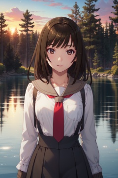 <lora:Nadeko-000013:0.8>,Nadeko cyql,1girl,looking at viewer,solo,brown hair,medium hair,blunt bangs,brown eyes,school uniform,long sleeves,necktie,high-waist skirt,suspender skirt,sailor collar,shirt,red necktie,white shirt,Angry, tightened jaw, squinted eyes, and raised eyebrows.,upper_body,beautiful face,beautiful eyes,glossy skin,shiny skin,Lake, Lakeside, Forest, Trees, Reflection, Serenity, Wildlife, Tranquility,(Climbing roses, Snow-covered cottage, Winter garden, Snowflakes, Winter wonderland, English charm:0.6),beautiful detailed sky,beautiful detailed glow,posing in front of a colorful and dynamic background,masterpiece,best quality,beautiful and aesthetic,contrapposto,female focus,wallpaper,fashion,