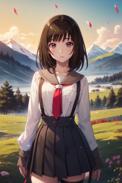 <lora:Nadeko-000013:0.8>,Nadeko cyql,1girl,looking at viewer,solo,brown hair,medium hair,blunt bangs,brown eyes,school uniform,long sleeves,necktie,high-waist skirt,suspender skirt,sailor collar,shirt,red necktie,white shirt,Dopey, Wide-eyed, slack-jawed, and with a goofy expression.,panorama,beautiful face,beautiful eyes,glossy skin,shiny skin,Meadow, Flowers, Mountains, Grass, Bees, Colors, Serenity, Breeze,(Bougainvillea, Citrus trees, Terracotta pots, Fountain, Mediterranean architecture, Warm breeze:0.6),beautiful detailed sky,beautiful detailed glow,posing in front of a colorful and dynamic background,masterpiece,best quality,beautiful and aesthetic,contrapposto,female focus,wallpaper,fashion,