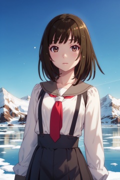 <lora:Nadeko-000013:0.8>,Nadeko cyql,1girl,looking at viewer,solo,brown hair,medium hair,blunt bangs,brown eyes,school uniform,long sleeves,necktie,high-waist skirt,suspender skirt,sailor collar,shirt,red necktie,white shirt,Neutral, A relaxed facial expression with a slightly open mouth.,upper_body,beautiful face,beautiful eyes,glossy skin,shiny skin,Glacier, Peaks, Mountains, Ice, Blue, Crevasse, Serenity, Wilderness,(Japanese maples, Snow-covered branches, Winter garden, Tranquil setting, Japanese elegance, Frosty beauty:0.6),beautiful detailed sky,beautiful detailed glow,posing in front of a colorful and dynamic background,masterpiece,best quality,beautiful and aesthetic,contrapposto,female focus,wallpaper,fashion,