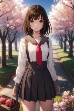 <lora:Nadeko-000013:0.8>,Nadeko cyql,1girl,looking at viewer,solo,brown hair,medium hair,blunt bangs,brown eyes,school uniform,long sleeves,necktie,high-waist skirt,suspender skirt,sailor collar,shirt,red necktie,white shirt,Annoyed, Mouth turned down slightly, eyes narrowed, and a tense jaw.,full_shot,beautiful face,beautiful eyes,glossy skin,shiny skin,Orchard, Apples, Blossoms, Spring, Trees, Colors, Serenity, Harvest,(Moss-covered stones, Stone lanterns, Moss gardens, Zen serenity, Rainy day, Meditation:0.6),beautiful detailed sky,beautiful detailed glow,posing in front of a colorful and dynamic background,masterpiece,best quality,beautiful and aesthetic,contrapposto,female focus,wallpaper,fashion,