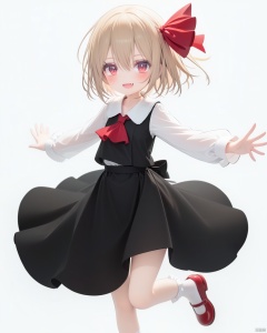 willy style, 1girl, rumia, blonde hair, solo, white background, red footwear, simple background, ribbon, red eyes, short hair, hair ribbon, shirt, long sleeves, open mouth, ascot, white socks, looking at viewer, full body, socks, red ribbon, red ascot, white shirt, shoes, frills, bangs, skirt, smile, mary janes, vest, dress, collared shirt, outstretched arms, hair between eyes, black dress, black skirt, :d, blush, black vest, bobby socks, collarbone, fang