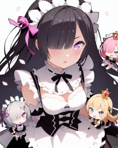 rella, natsuki subaru, rem (re:zero), multiple girls, ram (re:zero), roswaal mansion maid uniform, maid, short hair, emilia (re:zero), pink hair, blue hair, drill hair, hair ornament, 1boy, blue eyes, twin drills, blonde hair, smile, ribbon, x hair ornament, looking at viewer, hair over one eye, siblings, twins, 4girls, open mouth, hair ribbon, dress, chibi, black hair, sisters, long hair, crown, bangs, petals, breasts, blush, maid headdress, detached sleeves, 3girls, frills, mini crown, symbol-shaped pupils, purple eyes, pink eyes, pink ribbon, white background, grey hair, medium breasts,
