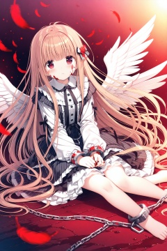 (masterpiece),(best quality),illustration,ultra detailed,hdr,Depth of field,(colorful),loli,1girl,solo,wings,blood,long hair,sitting,chain,red eyes,blood on hands,feathered wings,barefoot,blood on face,blood from eyes,dress,long sleeves,cuffs,feathers,frills,looking at viewer,very long hair,white wings,bandages,shackles,bangs,