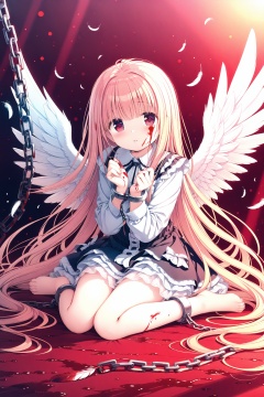 (masterpiece),(best quality),illustration,ultra detailed,hdr,Depth of field,(colorful),loli,1girl,solo,wings,blood,long hair,sitting,chain,red eyes,blood on hands,feathered wings,barefoot,blood on face,blood from eyes,dress,long sleeves,cuffs,feathers,frills,looking at viewer,very long hair,white wings,bandages,shackles,bangs,
