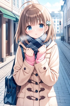 masterpiece,best quality,1girl, solo, outdoors, scarf, school bag, blush, bag, plaid, hair ornament, coat, brown hair, looking at viewer, sleeves past wrists, parted lips, long sleeves, skirt, fringe trim, hands up, breath, open clothes, day, plaid skirt, blue scarf, building, open coat, pink sweater, hairclip, sweater, pleated skirt, blue eyes, upper body, blue skirt, ahoge, plaid scarf, road, duffel coat, pink cardigan, street, school uniform, hair flower, white coat, flower, shoulder bag, cardigan