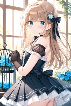 masterpiece,best quality,1girl, solo, gloves, dress, long hair, flower, black gloves, blush, window, looking to the side, looking at viewer, bare shoulders, black dress, brown hair, birdcage, detached sleeves, closed mouth, blue flower, cage, bow, blue eyes, indoors, puffy sleeves, from side, hair bow, white flower, puffy short sleeves, short sleeves, breasts, plant, strapless, strapless dress, black bow, hands up, small breasts, pleated dress, green eyes, frills