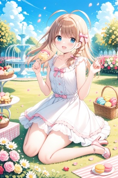 masterpiece,best quality,1girl, solo, outdoors, dress, white dress, flower, smile, long hair, braid, blue eyes, pink flower, day, :d, food, open mouth, high heels, looking at viewer, holding, blush, hair bow, rose, bow, pink rose, pink bow, collarbone, book, pink footwear, sky, cloud, brown hair, petals, birdcage, white flower, sleeveless dress, breasts, sleeveless, macaron, picnic, blue sky, holding food, bare shoulders, yellow flower, grass, cage, small breasts, hair ornament, fountain, tiered tray, basket, antenna hair, single braid, red flower, bare arms