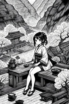 even,Ditu,1girl,sitting,scenery,east asian architecture,Line art,