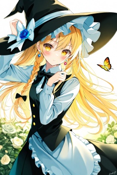masterpiece,best quality,illustration,ultra detailed,hdr,Depth of field,(colorful),Artist ame929,1girl,hat,kirisame marisa,blonde hair,solo,yellow eyes,bug,witch hat,butterfly,long hair,braid,bow,flower,apron,black headwear,single braid,long sleeves,hair ornament,earrings,jewelry,white bow,hair flower,shirt,white shirt,closed mouth,hair between eyes,waist apron,white apron,black bow,white flower,hat bow,black skirt,blush,bowtie,skirt,black bowtie,looking at viewer,rose,hair bow,vest,black vest,frills,signature,buttons,hand on headwear,