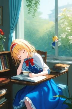 masterpiece,best quality,illustration,ultra detailed,hdr,Depth of field,(colorful),Artist rokusai,shanghai doll,alice margatroid,cup,hairband,closed eyes,bow,window,blonde hair,book,capelet,hair bow,flower,red bow,sleeping,short hair,curtains,plant,dress,long hair,1girl,blue dress,teacup,red hairband,chair,open book,paper,holding,
