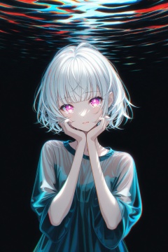 (masterpiece),(best quality),illustration,ultra detailed,hdr,Depth of field,(colorful),(chromatic aberration),(beautiful young female:1.4),(streaming tears),sad,(daisy),(daisy),(daisy),looking at viewer,partially submerged,both hands on own cheek,{see-through long shirt},{no bra},(white hair, short hair, bangs:1.2),(glowing eyes),ripples,dark water,black background,(prismatic),