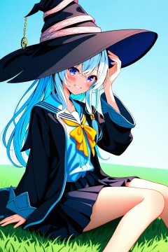(masterpiece),(best quality),illustration,ultra detailed,hdr,Depth of field,(colorful),nai3 Style,1girl,elaina (majo no tabitabi),solo,hat,witch hat,long hair,skirt,black headwear,smile,white hair,sailor collar,shirt,pleated skirt,blue eyes,long sleeves,hair between eyes,hand on headwear,sitting,white shirt,looking at viewer,bow,blush,robe,black robe,black skirt,open robe,white background,white sailor collar,purple eyes,grin,yellow bow,school uniform,bowtie,open clothes,grass,black coat,