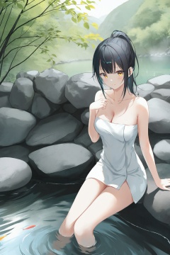 masterpiece,best quality,high quality,(colorful),[Artist toosaka asagi],[[[Artist wlop]]],[Artist chen bin],[Artist omone hokoma agm],Artist hiten (hitenkei),1girl,towel,solo,onsen,breasts,naked towel,sitting,looking at viewer,cleavage,rock,collarbone,water,sidelocks,bare shoulders,brown eyes,medium breasts,steam,outdoors,closed mouth,black hair,soaking feet,ponytail,blush,yellow eyes,