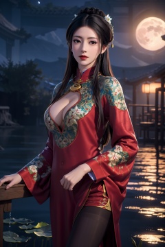 standing,dress,chinese clothes,flower,full_moon,moon,night,lily_pad,lotus,moonlight,nipples,water,night_sky,lily_\(flower\),sky,partially_submerged,1girl,solo,hair ornament,realistic,nail polish,photo_\(medium\),(big breasts, cleavage),makeup,(8k, RAW photo, best quality, masterpiece:1.2),(realistic, photorealistic:1.3),ultra-detailed,extremely detailed cg 8k wallpaper,(crystalstexture skin:1.2),extremely delicate and beautiful,(sexy pose:1.2),chinese dress,black pantyhose,