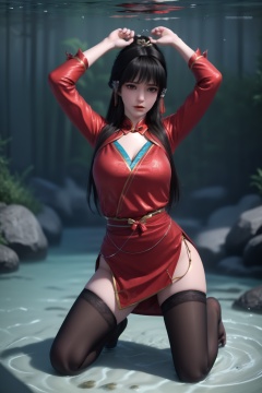 1girl,underwater,submerged,floating hair,air bubble,holding breath,see-through,masterpiece,best quality,highly detailed,fish,(wide hip:1.2),jellyfish,earrings,hair ornament,sea weed,coral reef,shark,sea turtle,sexy pose,kneeling,chinese dress,chinese clothes,big breasts,(looking at viewer:1.2),black pantyhose,arms up,torn pantyhose,