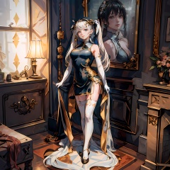 best quality, quality, masterpiece, (photorealistic:1.4), 1girl, kasugano sora, long white hair, twintails, hair ribbon, hair ornament, china dress, elbow gloves, thighhighs, holding stuffed toy, standing, full body, looking at viewer, detailed background, indoors, luxury decorations, window, dramatic lighting,<lora:KKhoutu_text_1:0.7>