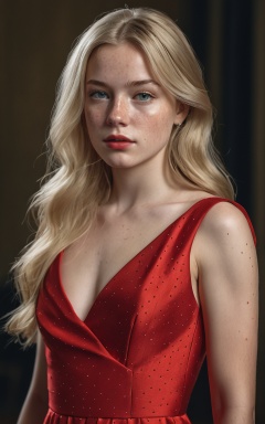 (best quality, 4k, 8k, highres, masterpiece:1.2), ultra-detailed, photorealistic, photography, 1girl, solo, long hair, looking at viewer, blonde hair, dress, upper body, lips, red dress, freckles, realistic