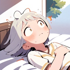 Lying on the bed, a woman in a cosplay costume sat on the bed with her hands on her head, panicked expression, blushing and sweating, white stockings, no shoes, sweating, scared looking, scorching environment, casual shorts, struggling