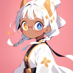 1girl, bangs, blue_eyes, blunt_bangs, braid, dark-skinned_female, dark_skin, glasses, heterochromia, horns, long_hair, long_sleeves, looking_at_viewer, pink_background, round_eyewear, semi-rimless_eyewear, shirt, simple_background, solo, twin_braids, upper_body, white_hair, white_shirt, yellow_eyes