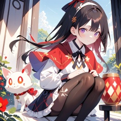 (masterpiece),(best quality),illustration,ultra detailed,hdr,Depth of field,(colorful),[pottsness],[iumu],[Sheya],1girl, akemi homura, sitting, long hair, pantyhose, black hair, purple eyes, hairband, kyubey, long sleeves, skirt, looking at viewer, argyle legwear, bangs, capelet, black pantyhose, frills, closed mouth, feet out of frame, black hairband, frilled skirt, ribbon, magical girl, :3, shirt, argyle, creature, knees together feet apart, neck ribbon, expressionless, on lap, white shirt, solo